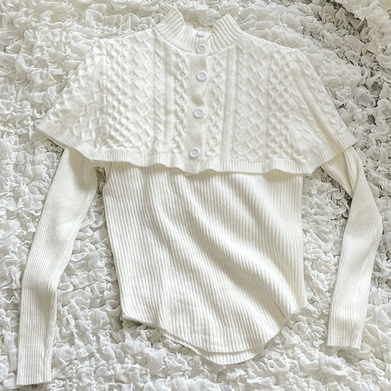甘さと上品さが共存する鍵編みケープニットインナーSET。優しい印象を与えるニット素材に、女性らしい揺れ感のあるケープが付いたデザインが特徴です。シンプルながらも存在感のあるデザインであり、リラックス感もしっかりと感じられます。